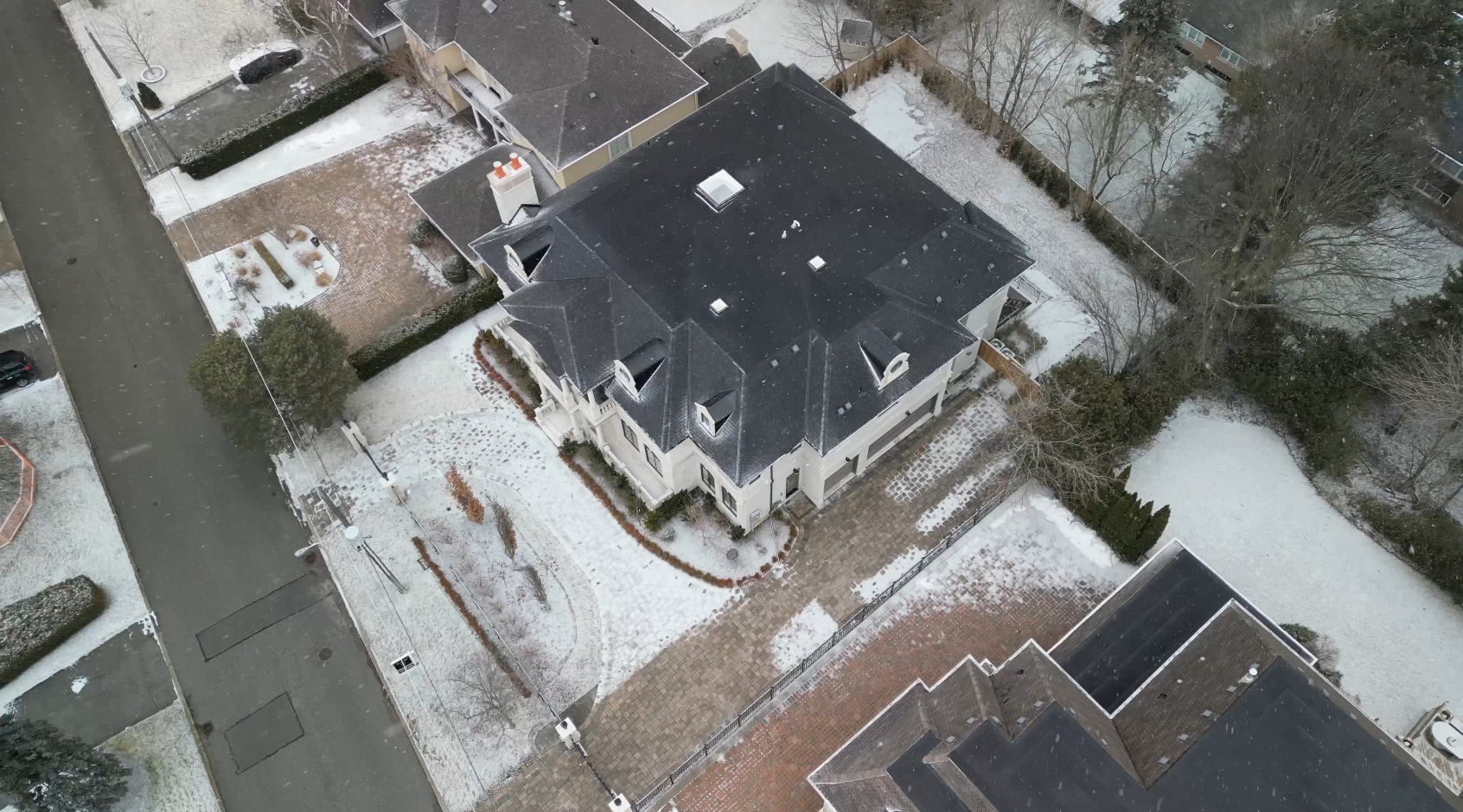 Outside view of the property taken on a snowy day using a handheld mobile gimbal and drone.